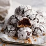 A pile of round chocolate crinkle cookies is stacked on a white parchment paper-covered metal tray, placed on a white marbled surface. Each cookie has a cracked, marbled dark chocolate outer layer dusted with a thick coat of white powdered sugar, giving a rough texture. One cookie is broken in half showing a soft, crumbly light brown inside. Light brown crumbs are scattered around the cookies, adding a casual feel to the presentation. Photo taken with an iphone --ar 4:5 --v 7