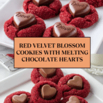 Keywords: red velvet cookies, chocolate blossom cookies, Valentine’s Day cookies, festive cookies, chocolate heart cookies