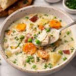 A close-up view of a bowl filled with creamy chicken pot pie soup showing three main layers: a rich creamy white broth as the base, mixed with chunks of white chicken meat, light brown red-skinned potato pieces, bright orange carrot slices, and vibrant green peas scattered evenly throughout. The soup is garnished with small bits of chopped green herbs and sprinkled with grated light yellow cheese for added texture. A silver spoon is partly immersed, holding a scoop of the soup near the top right edge of the bowl, which is white and speckled with dark brown spots. The setting includes a white marbled surface underneath, with white bowls of grated cheese and green herbs blurred in the background, and a piece of crusty bread on a wooden board to the side. photo taken with an iphone --ar 4:5 --v 7