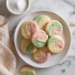 - Shape and Marble the Cookies – Spiral Method: Roll each colored dough into a rope approximately 3 inches long. Lay the ropes side by side (green, pink, and white), twist them together once, then coil the twisted ropes into a cinnamon roll shape. Flatten slightly to maintain shape.