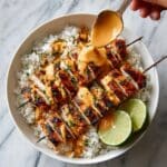 This Sweet Chili Chicken Bowl with Coconut Lime Drizzle is a vibrant and flavorful dish featuring tender marinated chicken thighs seared to caramelized perfection. Paired with fragrant jasmine rice and topped with a creamy, tangy coconut lime sauce, it’s a deliciously balanced meal with fresh cilantro and lime wedges for brightness.
