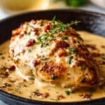 This Texas Roadhouse Smothered Chicken with Jack Cheese recipe features tender, boneless chicken breasts seared to golden perfection, then smothered in a flavorful garlic and paprika cream sauce topped with melted shredded jack cheese. Baked until bubbly and delicious, this comforting dish makes a perfect hearty meal.