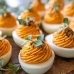 These Thanksgiving Appetizer Deviled Eggs are a classic crowd-pleaser with a smoky twist. Creamy yolks mixed with mayonnaise, Dijon mustard, lemon juice, and smoked paprika create a flavorful filling that’s elegantly piped back into halved hard-boiled eggs and garnished with fresh herbs. Perfect for holiday gatherings or any festive occasion.