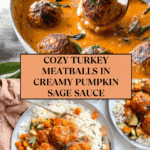Keywords: turkey meatballs, pumpkin sage sauce, baked meatballs, fall recipes, healthy turkey recipe, creamy pumpkin sauce, savory meatballs