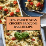 This Tuscan Chicken Broccoli Bake is a delicious low-carb meal that combines tender chicken, fresh broccoli, and a creamy pesto-infused cheese sauce. It’s easy to prepare and perfect for family dinners or meal prepping for the week.
