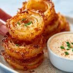 These Viral Parmesan Onion Rings are a crispy, flavorful twist on traditional onion rings, made by baking onions between layers of melted parmesan cheese and seasoned with garlic powder, paprika, and Italian seasoning. They’re a low-carb, gluten-free appetizer or snack that’s easy to prepare and wonderfully cheesy with a satisfying crunch.