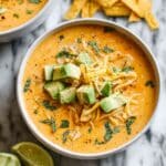 A creamy and flavorful White Chicken Chili made with tender shredded chicken, creamy beans, fresh corn, and a blend of aromatic spices. This comforting soup is enhanced with sour cream and topped with fresh cilantro, shredded cheese, avocado, and crispy tortilla chips, perfect for a hearty and satisfying meal.